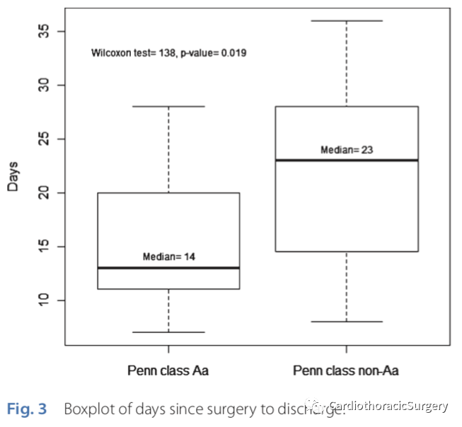 所有分析均在R软件上进行。变量以百分数的形式呈现并与 Pearson χ2-test 或 Fisher test进行对照。连续变量表现为标准差和均数。95%的置信区间被用来分析Penn分类与院内死亡率的关系。基线组由无症状病人组成(Aa型);分析术后住院率(ICU住院时间,普通病房住院时间,住院总时间)与Penn分类的关系(Aa型对比非Aa型),计算Wilcoxon rank sum tests。
