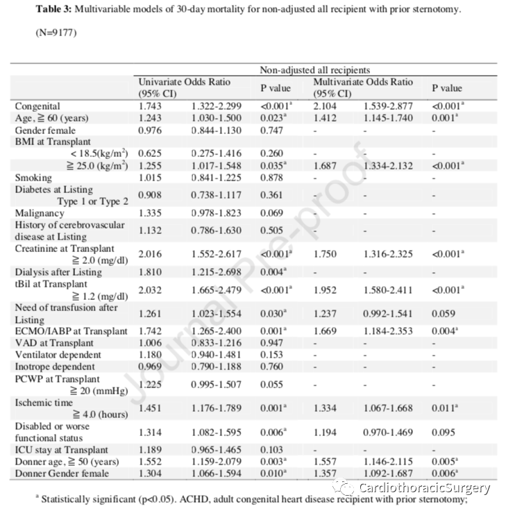表3,未经调整的所有既往接受胸骨切开术患者30天死亡率的多变量模型.