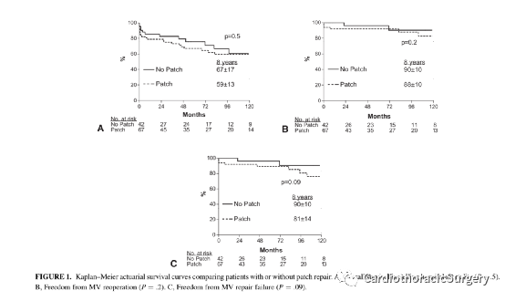 在这个为期20年的活动期心内膜炎二尖瓣成形手术的回顾性研究中,我们发现成形倾向的手术应用方法有着80%的修复率且病死率在可接受范围和良好的长期预后。60%的病例显示补片成形常用于保留瓣膜功能,且在耐用性方面与非补片重建技术相似。 我们针对活动期IE的专项研究与不太激进的重建手术相比,在病死率方面并没有太大区别。这个发现可能的解释是对于IE病人,二尖瓣成形所带来的潜在效益被疾病相关因素所抵消,如高龄,相关合并症,和瓣周张力,这些都是病死率的有力预测因素。但是,就如Feringa及其同事在一篇meta分析所报导的那样,IE病人中二尖瓣成形对比二尖瓣置换,我们坚信二尖瓣成形的获益要更大,因为二尖瓣成形在心血管事件和IE复发率要更低。 至于二尖瓣成形的耐用性方面,对于那些接受在二尖瓣退行性病变经典使用的非补片技术的IE病人,耐用性与退行性病变的二尖瓣成形的长期预后相似。比起非补片技术,使用补片来实现瓣叶扩大或瓣环成形远期衰败的几率要更高,但是这个区别并没有统计学差异。补片修复效果比较好的理由可能是我们仅在局部使用补片,尽可能使用自体组织,并且根据我们手术技术的情况来选择补片类型。值得注意的是,补片的耐用性同样受补片类型和补片使用方式的影响。对于心包补片,用它来治疗瓣叶瘘道的病人有着更好的耐用性。因此,瓣叶游离缘,甚至是更薄的瓣环,无论何时都应尽可能保留。从后瓣叶到前瓣叶自体移植的翻瓣技术,并未有衰败的案例;这种技术更广泛的应用可能是提高前瓣叶游离缘成形预后的一种选择。 早期成形失败所发现的缝线撕裂可能是由于缝线组织过高的张力所导致的。在这个问题上有两个理论上的技术解决方法:减少缝线处的张力以及缝线加固。例如,除外四边形切除,更加积极的瓣环切除可以瓣叶接合处的张力。额外的人工腱索或腱索转移将会减少游离缘补片处或三尖瓣自体移植乳头肌缝线处的张力。另一方面,缝线自身的加固可以通过健康组织缝合来实现(如非炎症组织等),或者通过缝更多组织,或者多一层连续缝合。