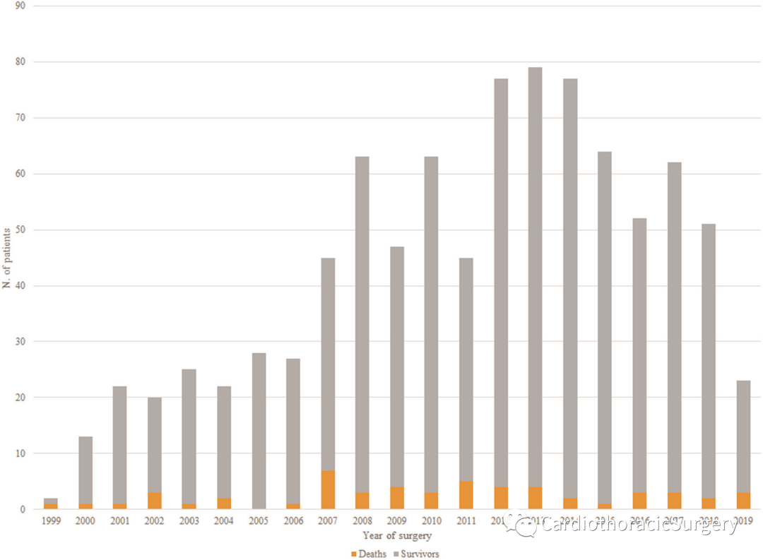 方法:1999年至2019年,907例ALCAPA病患者接受了手术修复,并被纳入本研究。主要结果为住院死亡率。次要结果包括同期二尖瓣手术和术后机械循环支持(MCS)的频率和结果。