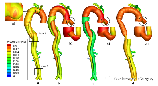 图7:术前(a)、术后(b)、随访1个月(c)、随访1年(d)时全主动脉的压力分布图。a1为撕裂入口处压力分布、b1、c1、d1为人工血管与升主动脉吻合处压力分布细节。术前压力自升主动脉至髂动脉逐渐降低,主动脉入口至髂动脉分叉间压降为5.96 mmHg,尽管假腔中的压力总是比TL中的略小,但在区域1和2中出现了相反的现象。局部峰值压力出现在近端撕裂入口处,而不是远端再撕裂处,术后主动脉弓和降主动脉的真腔压力显著增加,导致从主动脉入口至髂动脉分叉处的压降显著增加,另外,人工血管吻合处局部压力明显增加。