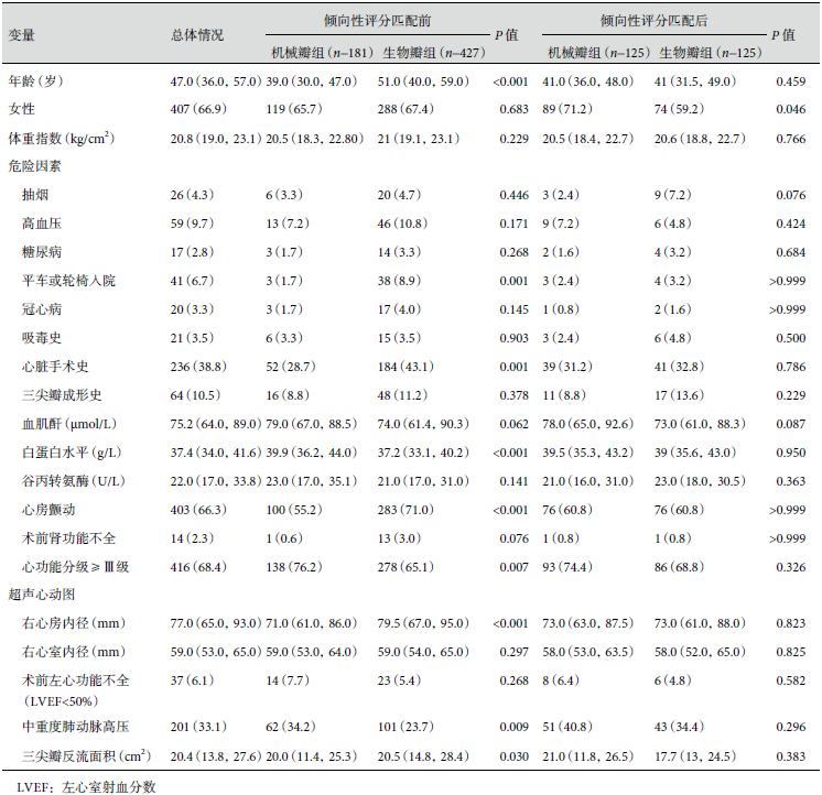 根据手术 ICD 编码 35.14(三尖瓣成形)、及35.27、35.28(TVR)进行搜索结合纳入及排除标准,共有 608 例 TVR 患者纳入本研究,其中男 201 例、女 407 例,中位年龄 47.0(36.0,57.0)岁。同期有 15 600 例患者单独或合并行三尖瓣成形,TVR 占三尖瓣手术总量的 3.8%。427 例使用生物瓣,181 例使用机械瓣。三尖瓣病变最主要的病因是风湿性,共 383 例(63%),其它原因包括先天性 96 例(15.8%)、功能性改变 70 例(11.5%)、感染性 51 例(8.4%)、单纯瓣下腱索断裂 5 例(0.8%)、创伤性 2 例(0.3%)、肿瘤累及 1 例(0.2%)。既往接受心脏开胸手术患者(心脏手术史)共 236 例(38.8%),其中孤立性三尖瓣成形或其它心脏手术同期合并三尖瓣成形(三尖瓣成形史)共 64 例(10.5%),生物瓣组再次心脏手术比例更高(P=0.001)。三尖瓣生物瓣组与机械瓣组的术前基本资料见表 1。术前两组患者基线资料差异明显,生物瓣组患者术前心功能Ⅲ级及以上患者比例较高,且术前彩超提示生物瓣组右心房内径较机械瓣更大,提示术前生物瓣组右心功能不全患者比例较高。进行倾向性评分匹配后(propensity score matching,PSM),共有 125 组病例纳入统计,匹配后数据显示机械瓣组女性患者比例更高(P=0.046),其它术前危险因素差异无统计学意义。