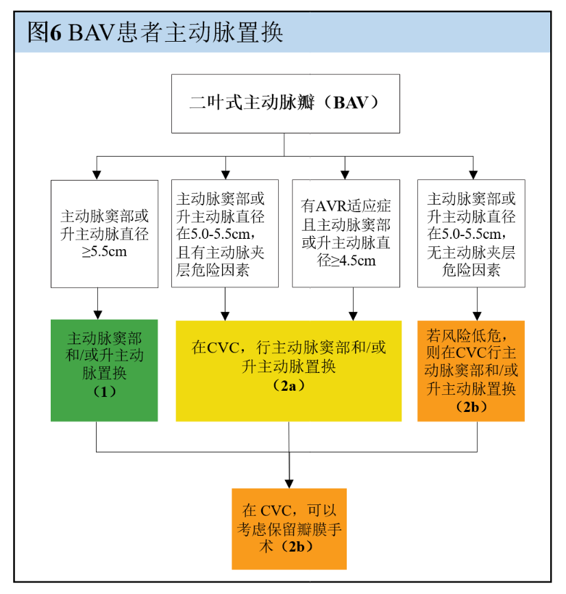 5. 对于AS或AR严重程度尚不符合主动脉瓣置换标准的患者,主动脉扩张到何种程度会导致主动脉夹层的风险高危到需要手术干预的数据尚不足。在无症状BAV和主动脉窦和/或升主动脉直径5.0 – 5.5厘米的低手术风险的患者,在没有主动脉夹层危险因素的情况下,主动脉部窦和/或升主动脉手术可以在综合瓣膜中心进行。此外,需要患者和医疗保健团队共同决策,以清楚地概述手术的风险及其对未来主动脉夹层发生风险降低作用进行权衡(4-7,10-14)。