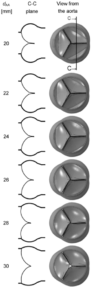 为了防止反流,人们认为最好使瓣膜完全关闭,并有一个相对较大的对合面积。结果发现,增加主动脉瓣环的直径会降低二维切面(C-C平面)的对合高度,这一结果与超声心动图测量结果相似。这似乎是合理的,并与瓣膜保留手术中的假设和主动脉瓣修复中最近的观察结果一致。更有意义的参数可以根据当前的3D模型进行计算,这些参数是根据整个对合区域定义的。虽然这些参数与2D测量结果相似,但它们可以捕获可能隐藏在2D视图中的不连续接触,例如在28 mm的情况下发现的不连续接触。似乎许多医学界人士估计NCCA在30%至50%之间,尽管我们的研究将NCCA值定在3%至27%之间。我们目前估计的ncca值与其他计算模型有很好的相关性。