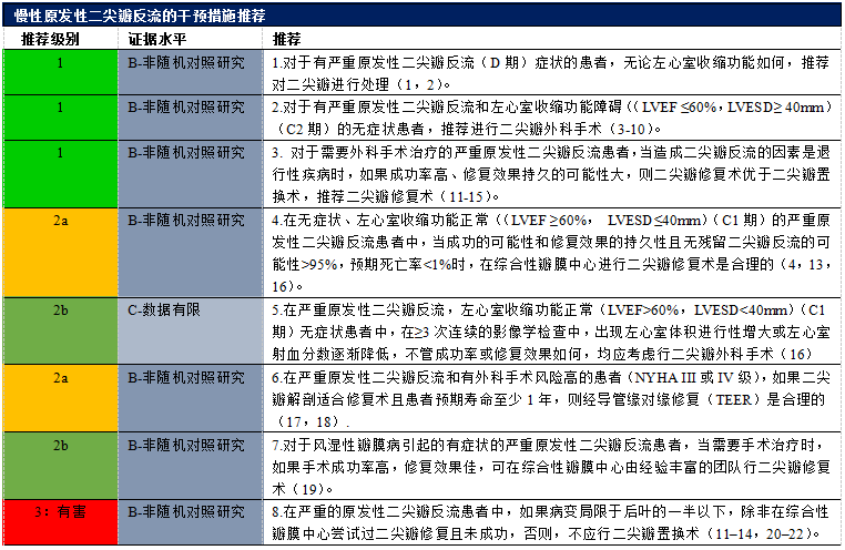 7. 二尖瓣反流 7.1. 急性二尖瓣反流 二尖瓣各部分的受损均会导致急性MR。感染性心内膜炎会导致瓣叶穿孔及慢性瓣叶破裂。二尖瓣粘液瘤的病人可能会发生自发性的腱索断裂。乳头肌断裂常发生于ST段抬高型心梗患者中,多见于下壁心肌梗死。左心室、左心房的急性容量负荷过高会导致肺淤血及心输出量降低(1-4)。尽早诊断和及时处理往往可以拯救生命。 7.1.1. 急性二尖瓣反流的诊断 对于急性MR的患者,TTE是评估左心 室功能、右心室功能、肺动脉压及二尖瓣功能的首选影像学方法。对于可能由慢性腱索断裂导致严重MR的患者,通常会伴随因血流动力学异常而产生的呼吸困难。突然的左心室高负荷增加了左心房及肺静脉压力,从而导致肺淤血及缺氧。于此同时,组织的低血流灌注及左心室收缩压降低,导致跨瓣压差降低,从而导致了二尖瓣提前关闭。因此,二尖瓣关闭不全的杂音可能短促且不明显,并且超声下的血流信号亦不明显。在心梗伴随急性血流动力学不稳定,但TTE证实左心室高动力性且排除了其他退化因素导致的新功能恶化时,TTE进一步探查乳头肌、腱索断裂、瓣膜赘生物、瓣周脓肿等需紧急手术的情况非常有必要(1)。 7.1.2. 治疗方案 使用血管扩张剂可以改善急性MR的血流动力学。在急性MR中使用血管扩张剂的目的是降低主动脉阻力,从而减少左心室向左心房的反流,降低二尖瓣反流,增加左心室到主动脉的正向血流输出(1,2)。通常采用易于静脉滴注的药物进行,如硝普纳及尼卡地平。血管扩张剂应禁用低血压的情形,因为血管张力降低时,降压药会进一步加重低血压。主动脉内球囊反搏(IABP)对于急性MR的治疗有一定帮助。IABP可以降低收缩压,从而降低左心室后负荷、增加输出量的同时降低反流。此外,IABP可以增加舒张压及平均动脉压,从而有助于体循环。ECMO的使用可以减少急诊手术前的血流动力不稳定所带来的损伤。 7.1.3. 干预 对于有症状的急性原发性MR患者,及时的二尖瓣手术(如果可能的话,最好是二尖瓣修复)是能够拯救患者生命的。急性原发性MR的严重程度往往是不同的。因为左心室扩张可以降低充盈压、增加输出量,因此,一部分二尖瓣反流程度较大的患者可以通过左心室扩张发生代偿作用。然而,大部分急性严重的MR患者需要手术恢复正常的血流动力学状态及缓解症状(1–5)。这对于因乳头肌断裂而导致的严重MR的患者尤为重要,因为发生这类二尖瓣反流时患者耐受性很差。 7.2. 慢性原发性二尖瓣反流 7.2.1. 慢性二尖瓣反流的分期 在评估慢性二尖瓣关闭不全的患者时,区分慢性原发性(退行性)二尖瓣关闭不全及慢性继发性(功能性)二尖瓣关闭不全是很重要的,因为这两种情况的差异很大。原发性二尖瓣关闭不全是二尖瓣病变所导致的,而继发性二尖瓣关闭不全是由心房或心室病变所导致的。在原发性二尖瓣关闭不全中,一个以上的瓣叶成分(小叶、腱索、乳头肌、瓣环)的病变导致二尖瓣功能不全,从而导致收缩期心室至心房的血液反流(表17)。在发达国家中,二尖瓣脱垂是导致慢性原发性MR的主要原因,其病因及表现较广泛。年轻人主要表现为前叶、后叶及腱索严重的粘液样变性及脱垂(Barlow’s valve)。部分患者出现室性心律失常、二尖瓣环断裂及左心室扩张。另外,老年患者会出现弹性纤维缺乏的疾病,这种疾病因腱索缺乏结缔组织而导致断裂。两种不同的病因对于手术存在一定影响。其他不常见的慢性原发性MR的病因包括感染性心内膜炎、结缔组织疾病、风湿性心脏病、二尖瓣裂和放射性心脏病。如果慢性原发性MR所导致的高容量负荷持续时间长且严重,则会导致心肌损害、心衰甚至最终导致死亡。在不可逆变化发生前纠正二尖瓣反流,可以使损伤心肌得到恢复。 7.2.2. 慢性原发性二尖瓣反流的诊断及随访 7.2.2.1. 诊断方法:初步诊断 概要 对于原发性MR患者,TTE是观测瓣膜形态、评估二尖瓣反流严重程度及左心室形态的首选影像学检查。当从TTE中获得的信息不充分或不一致时进行TEE、CMR或心导管检查。TEE也被应用于二尖瓣介入治疗。 诊断试验推荐:慢性二尖瓣反流的初步诊断 推荐级别 证据水平 推荐 1 B-非随机对照研究 1.对于已知或怀疑有原发性二尖瓣反流的患者,推荐经胸心脏超声评估左心室大小和功能、右室功能、左房大小、肺动脉压以及原发性二尖瓣反流的机制和严重程度(A~D期)(1-5)。 1 C-专家建议 2.对于原发性二尖瓣反流患者,当经胸心脏超声提供的信息不足或不一致时,推荐经食道心脏超声评估二尖瓣反流的严重程度、二尖瓣反流的机制和左心室功能状态(B~D期)。 1 B-非随机对照研究 3.在原发性二尖瓣反流患者中,推荐心脏磁共振评估左心室和右室容积和功能,当临床评估与心脏超声结果不一致时,心脏磁共振可能有助于评估二尖瓣反流的严重程度(6-9)。 1 B-非随机对照研究 4.对于接受二尖瓣介入治疗的严重原发性二尖瓣反流患者,推荐术中经食道超声可为原发性二尖瓣反流(C期和D期)建立解剖基础并指导修复(10,11)。 具体推荐建议 1. TTE可以为慢性原发性MR的临床决策提供必要的诊断数据(1-5,12)。慢性原发性MR患者的预后取决于病变的严重程度(5)、患者症状严重程度(13-15)、左心室病变程度及瓣膜病变是否可以得到修复。瓣膜修复可行时,应优先选择瓣膜修复术而不是二尖瓣置换。通常只有严重的MR会导致一些的不