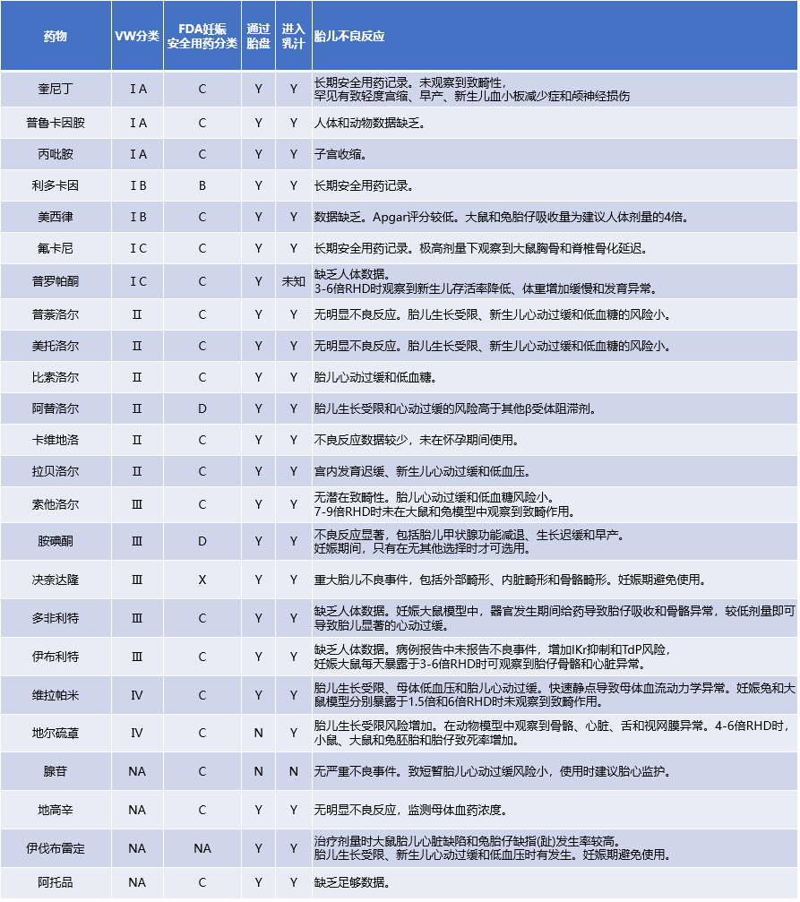 常用抗心律失常药物的妊娠期不良事件总结于表1。