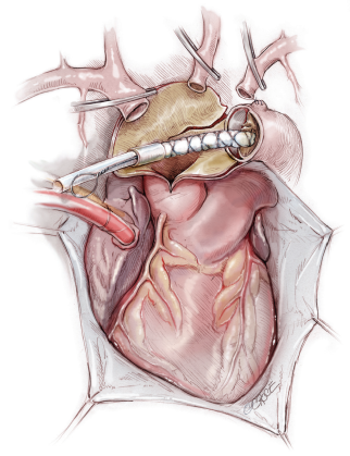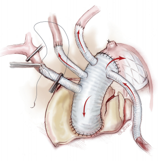 孙氏手术通过正中开胸、体外循环,右腋窝动脉插管选择性脑灌注下进行。仰卧位全身麻醉。监测左桡动脉和左股动脉的血压。我们使用经颅多普勒超声和脑电图来监测整个手术过程中大脑的血流速度和脑电活动。正中开胸过程中,要小心避免血压变化引起的主动脉破裂,特别是急性夹层患者。 右腋动脉插管是我们首选的体外循环动脉插管位置。右腋动脉通过右锁骨下方1cm的右侧胸肌三角凹槽区域的一个5-8cm斜切口进行暴露(an oblique 5-8 cm incision in the right deltopectoral groove 1 cm below the clavicle),分离胸大肌纤维后,牵拉胸小肌,仔细游离术野中的邻近静脉和臂丛。分别进行动脉插管(the arterial line is bifurcated),以通过右腋动脉进行选择性脑灌,通过四分支血管灌注腹主动脉和下肢。在大多数情况下,右腋动脉可以通过Willis环为两个脑半球提供足够的灌注。建立CPB的其他插管还包括通过右心房放置的双腔静脉插管和通过右上肺静脉或主肺动脉放置的左心引流管。 游离无名静脉,在某些情况下,直接切断以更好暴露(9)。充分暴露、游离弓上血管。肝素化后,CPB以2.0-2.4L/m2/min的流量启动,降温。从主动脉前侧轻轻剥离并注意保护左侧膈神经和左侧迷走神经。 阻断升主动脉远端,切开升主动脉后经冠状动脉口间断灌注冷机血心脏停搏液。降温期间,更换升主动脉(以及一些患者的主动脉根部或瓣膜),如果有需要,还进行其他伴随手术。当鼻咽部温度达到25℃时,将患者置于倾斜约20℃的头低脚高体位(Trendelenburg position),停循环。依次阻断三条弓上血管后,以5-10mL/kg/min的流量开始通过右腋窝动脉进行顺行脑灌注。在CPB期间,平均灌注压应维持在40-60mmHg。左桡动脉测压20mmHg或更高,被认为足以进行脑灌注。